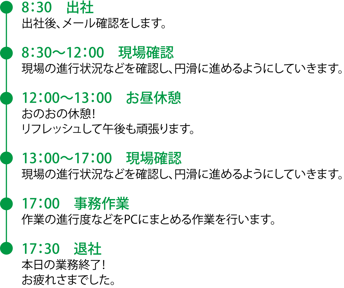 現場による 担当現場を2〜3つ掛け持ちしていただきます |